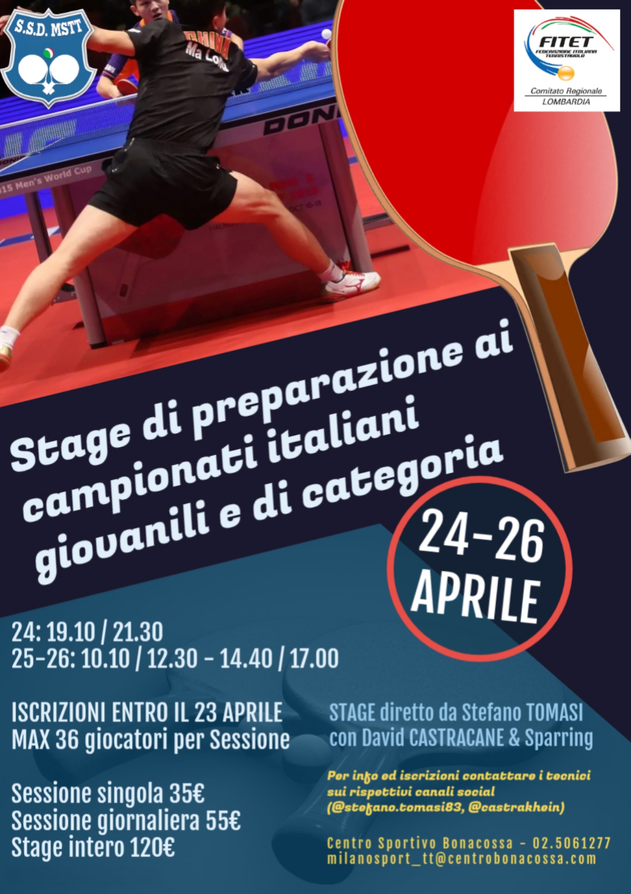 Dal 24 al 26 aprile, presso l’impianto di Via Mecenate 74 a Milano, i nostri tecnici Stefano Tomasi e David Castracane guideranno uno stage dedicato alla preparazione per i Campionati Italiani giovanili e di categoria.